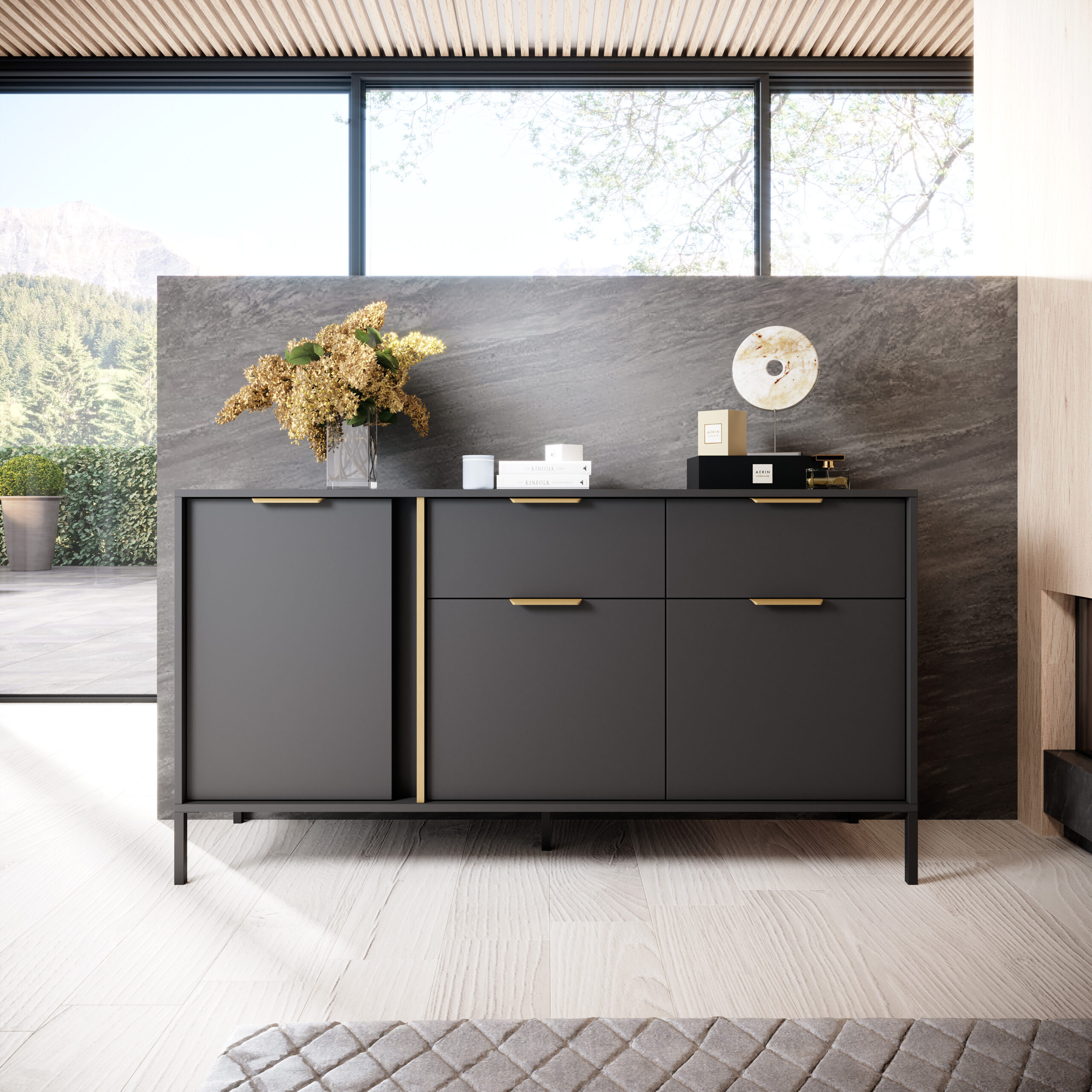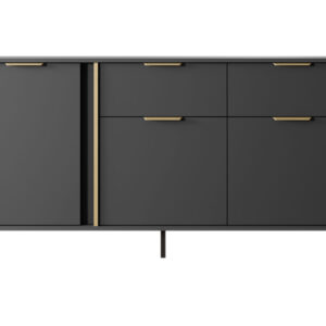 Komoda 3 – Drzwiowa z 2 Szufladami LARS to niezwykła mozaika smaku, stylu i szyku, która przypadnie do gustu nawet najbardziej wymagającym klientom. Klasyczny antracyt wzbogacony został złotym obrzeżem ABS na przegrodzie i złotymi uchwytami, co dodaje meblom elegancji i niepowtarzalnego stylu. Z kolekcją LARS z łatwością urządzisz modny i funkcjonalny salon.