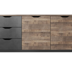 Komoda z szufladami z kolekcja ARDEN to meble w oryginalnym, industrialnym stylu. Połączenie dębu klepkowego z lekko porysowanym, ciemnoszarym metalem, przyciemnione szyby witryn z hartowanego szkła, ciemny, kontrastowy HDF oraz poziome oświetlenie półek nadadzą wnętrzu niepowtarzalnego, loftowego klimatu. Całość podkreślona została na bokach ramkami z naturalnej sklejki w kolorze czarnym, służącymi jako nogi.