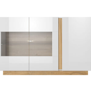 Komoda z Witryną Arco z zestawu Mebli salonowych Arco, dzięki swojemu oryginalnemu wyglądowi i frontom w połysku przykuwa uwagę każdego gościa w twoim domu, Komoda jest na systemie push-to-open dzięki czemu wystarczy delikatnie nacisnąć by otwierały się fronty dodatkowo zastosowane są zawiasy z domykiem.
