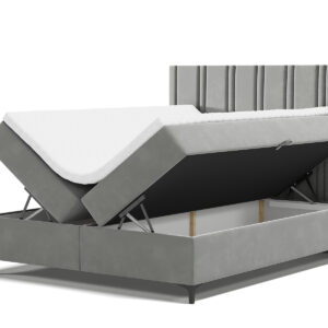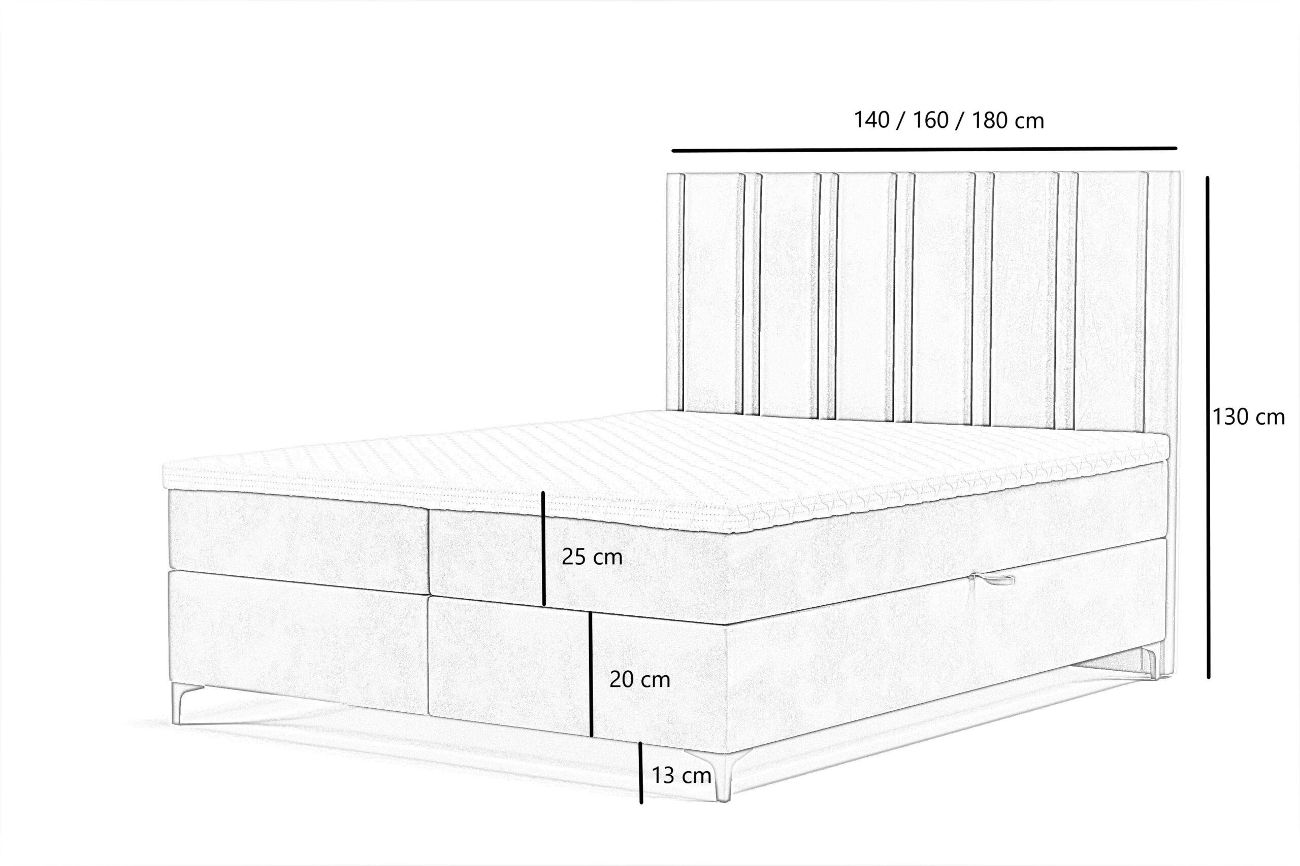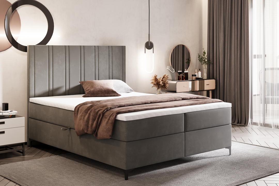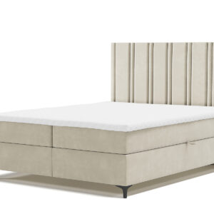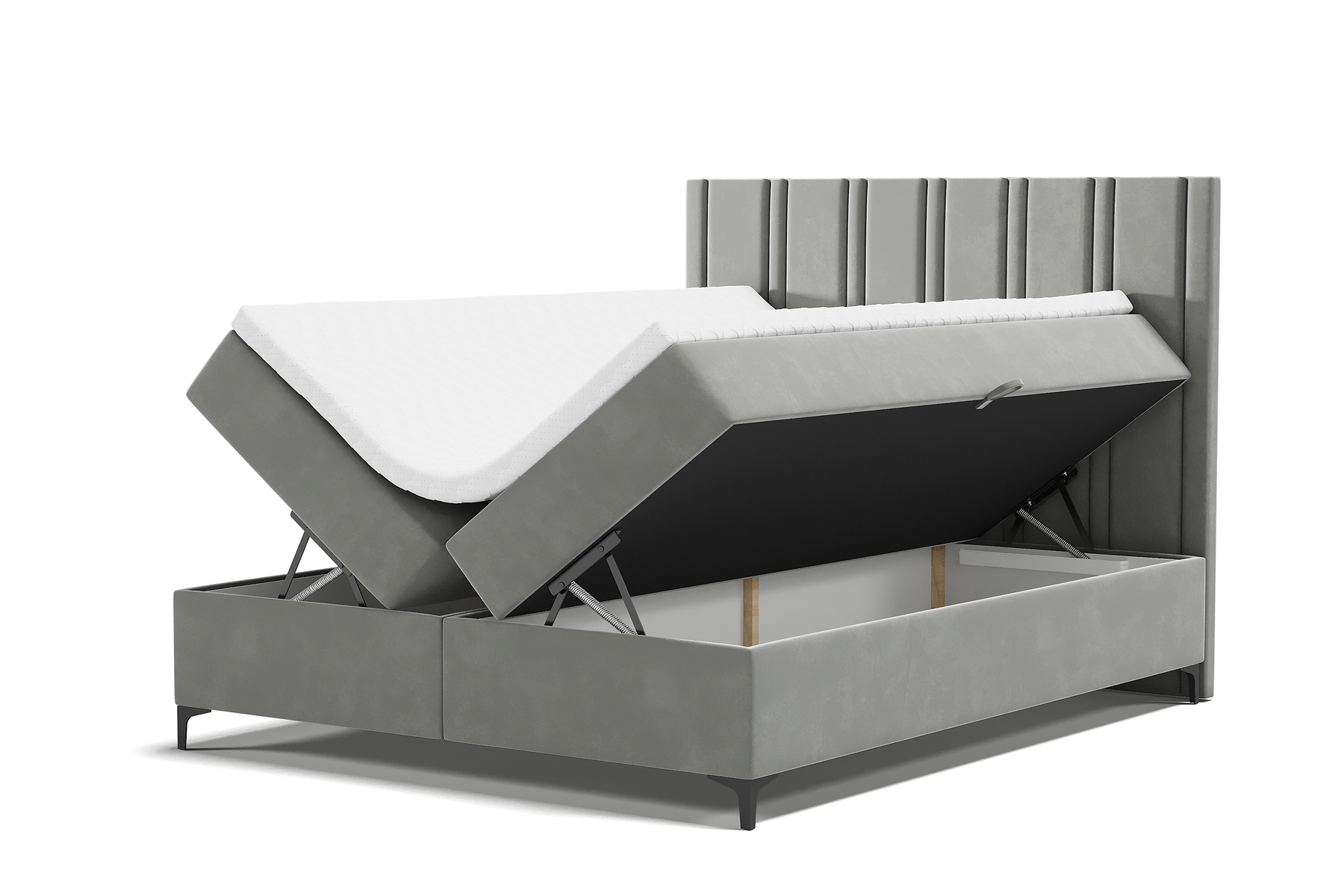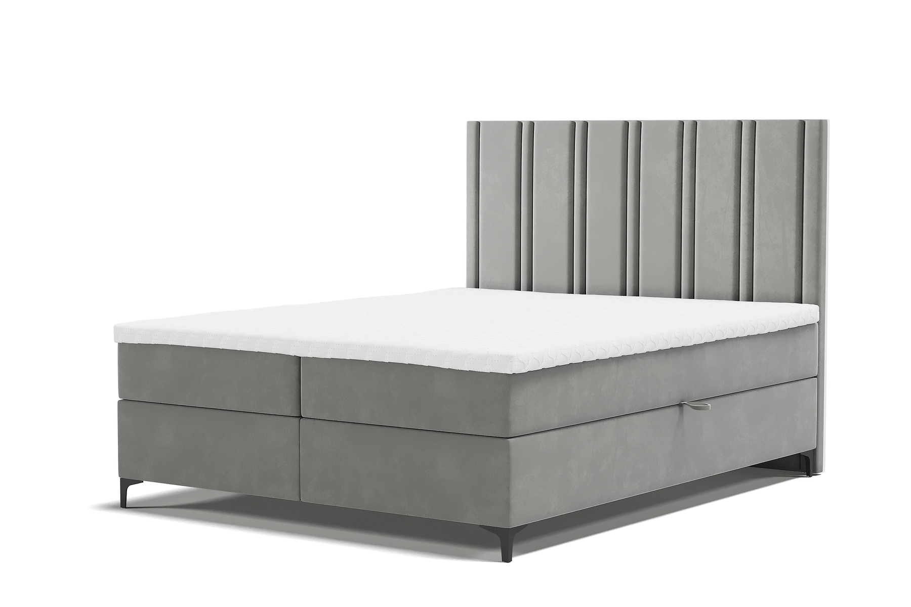 Łóżko kontynentalne MILO z pojemnikami w tkaninie welur to stylowy i praktyczny mebel do sypialni. Łóżko to posiada trzy warstwy: stelaż, materac i topper. Jednak w tym przypadku, stelaż jest wyposażony w pojemniki, które pozwalają na przechowywanie pościeli lub innych przedmiotów.