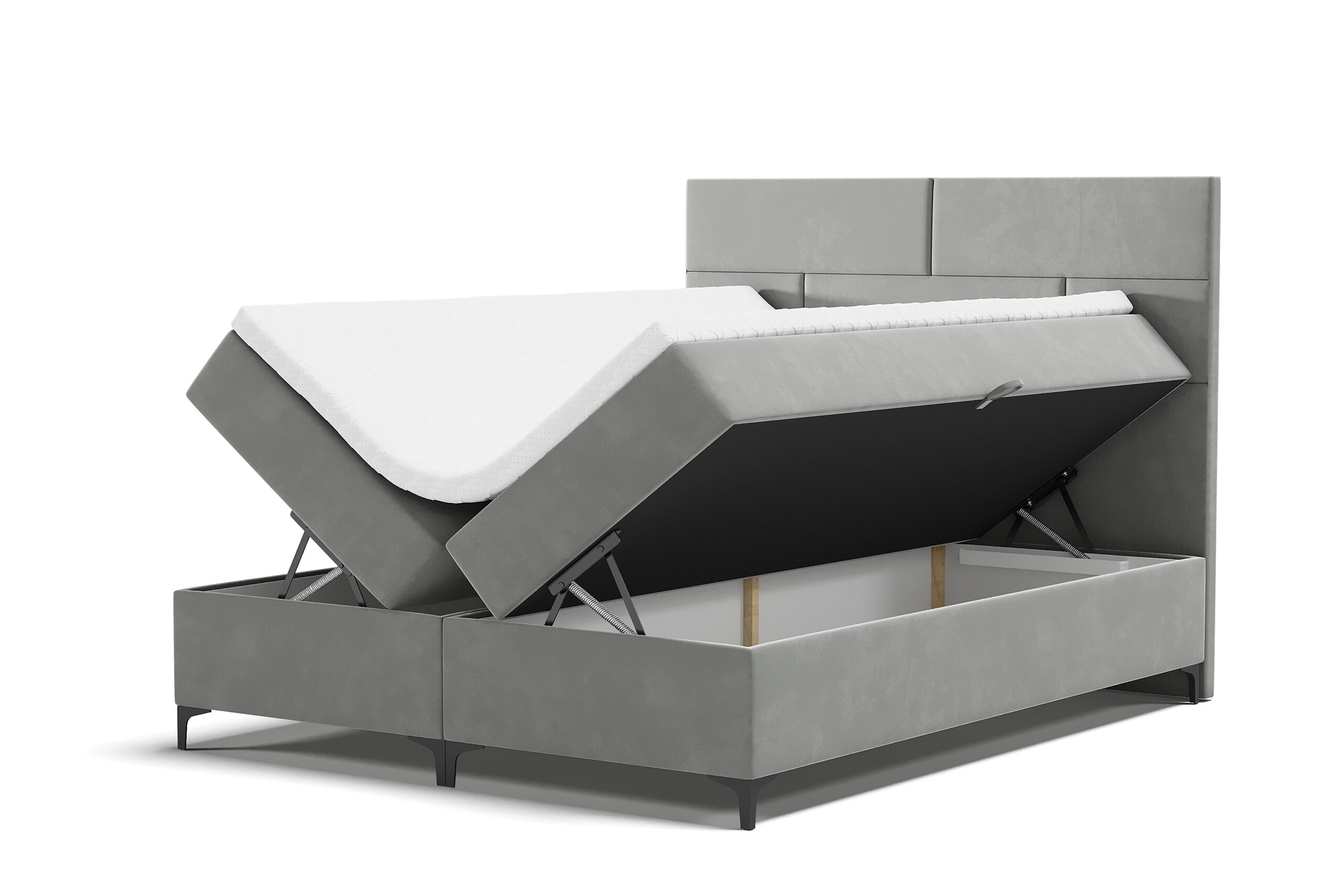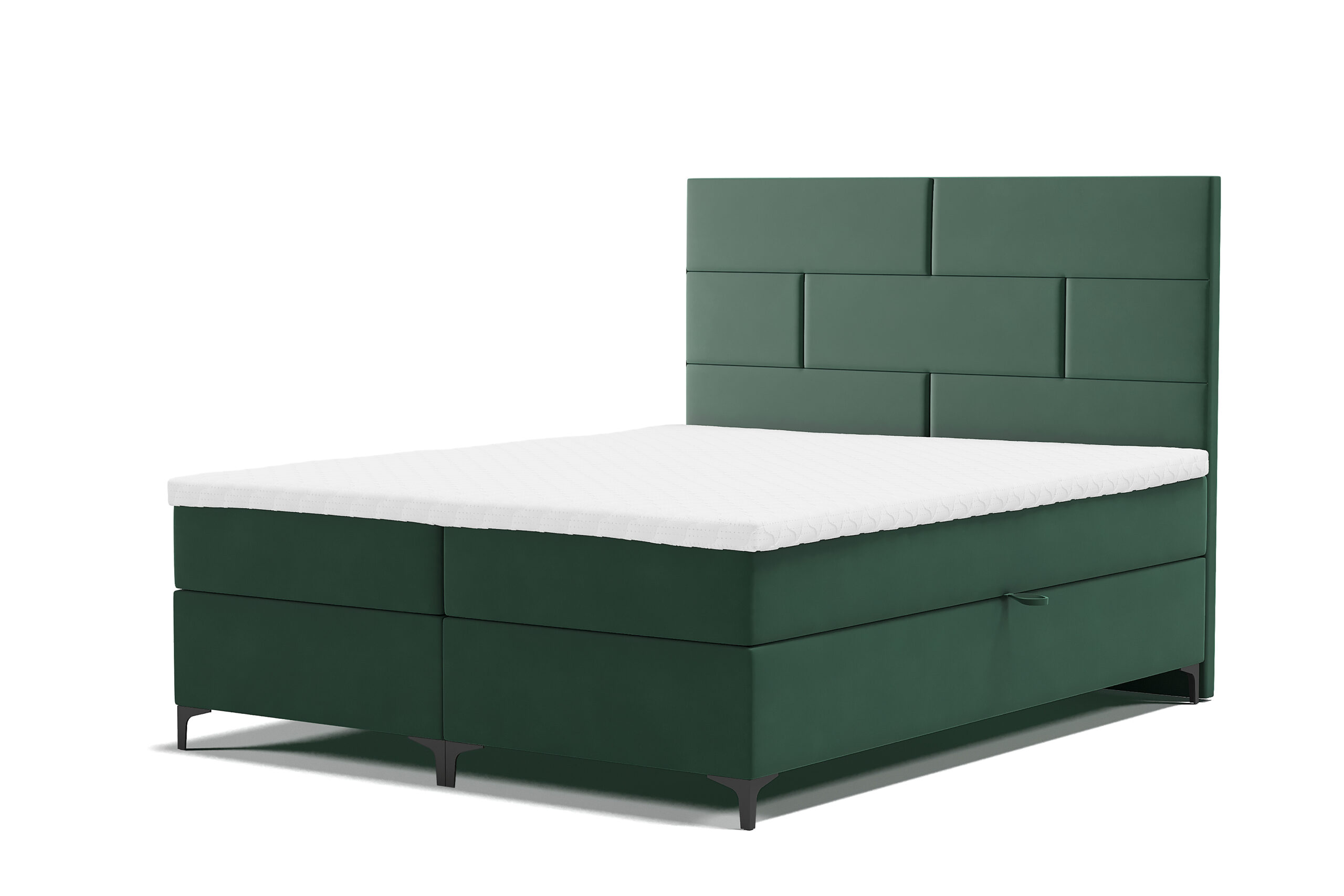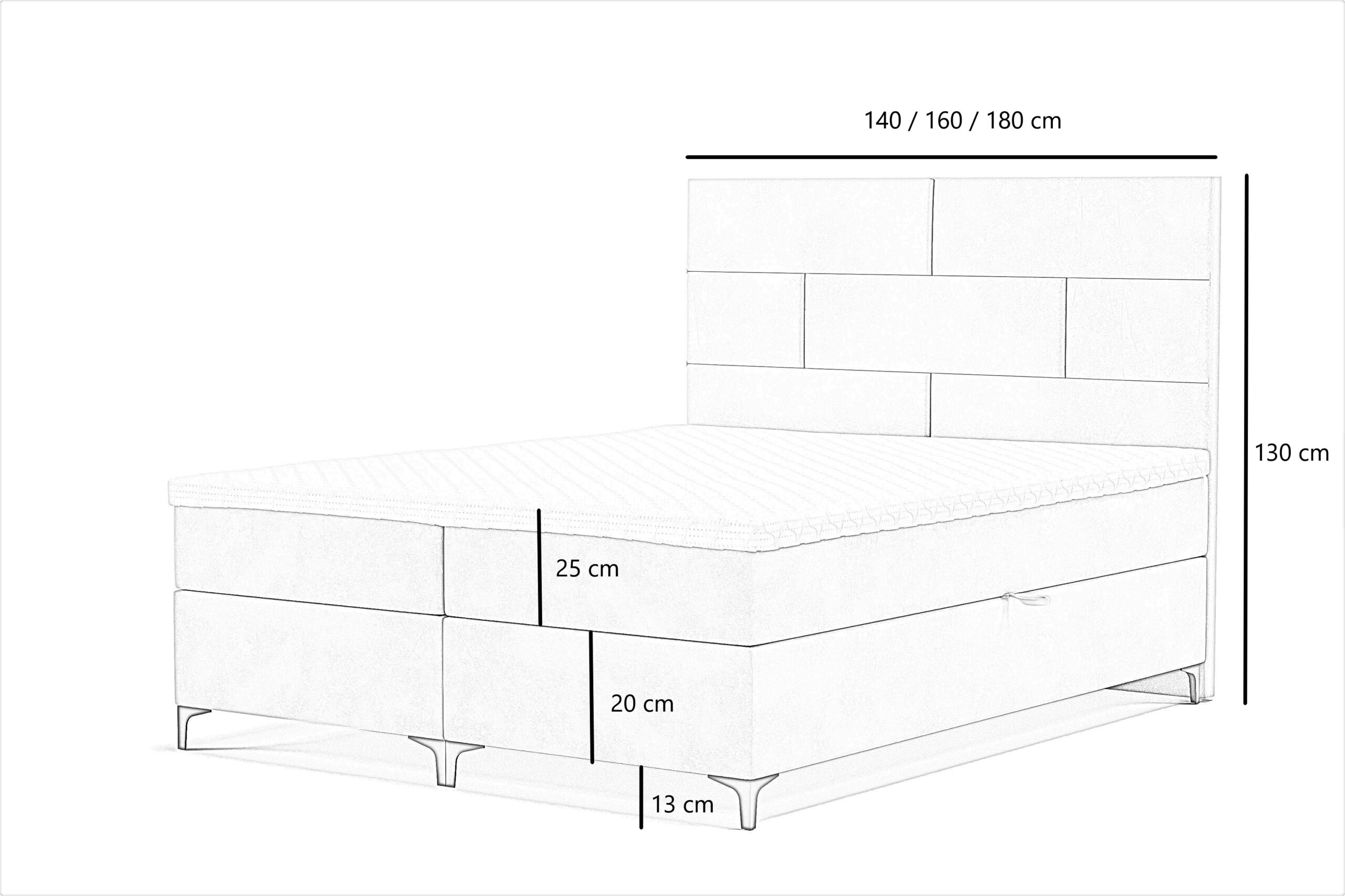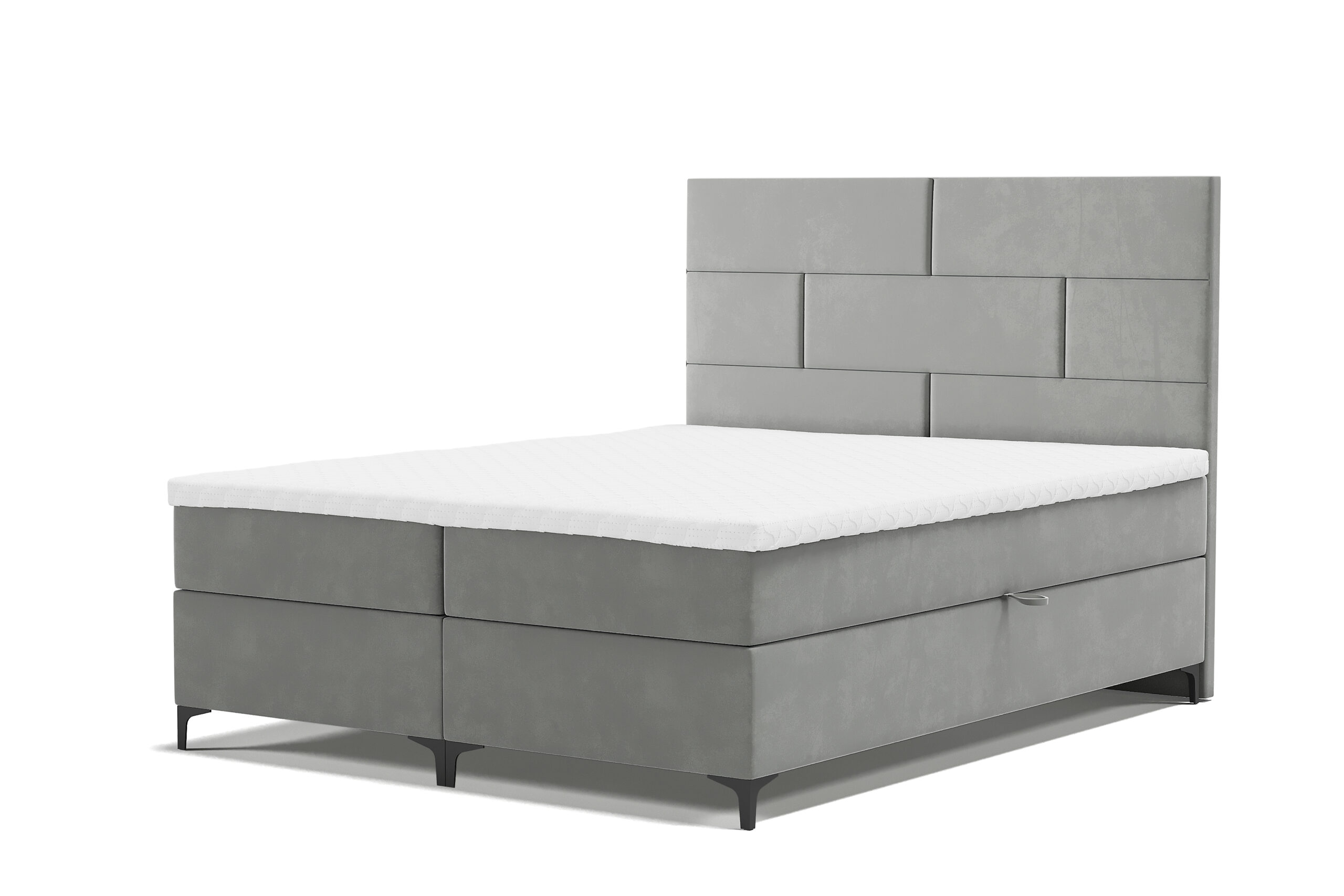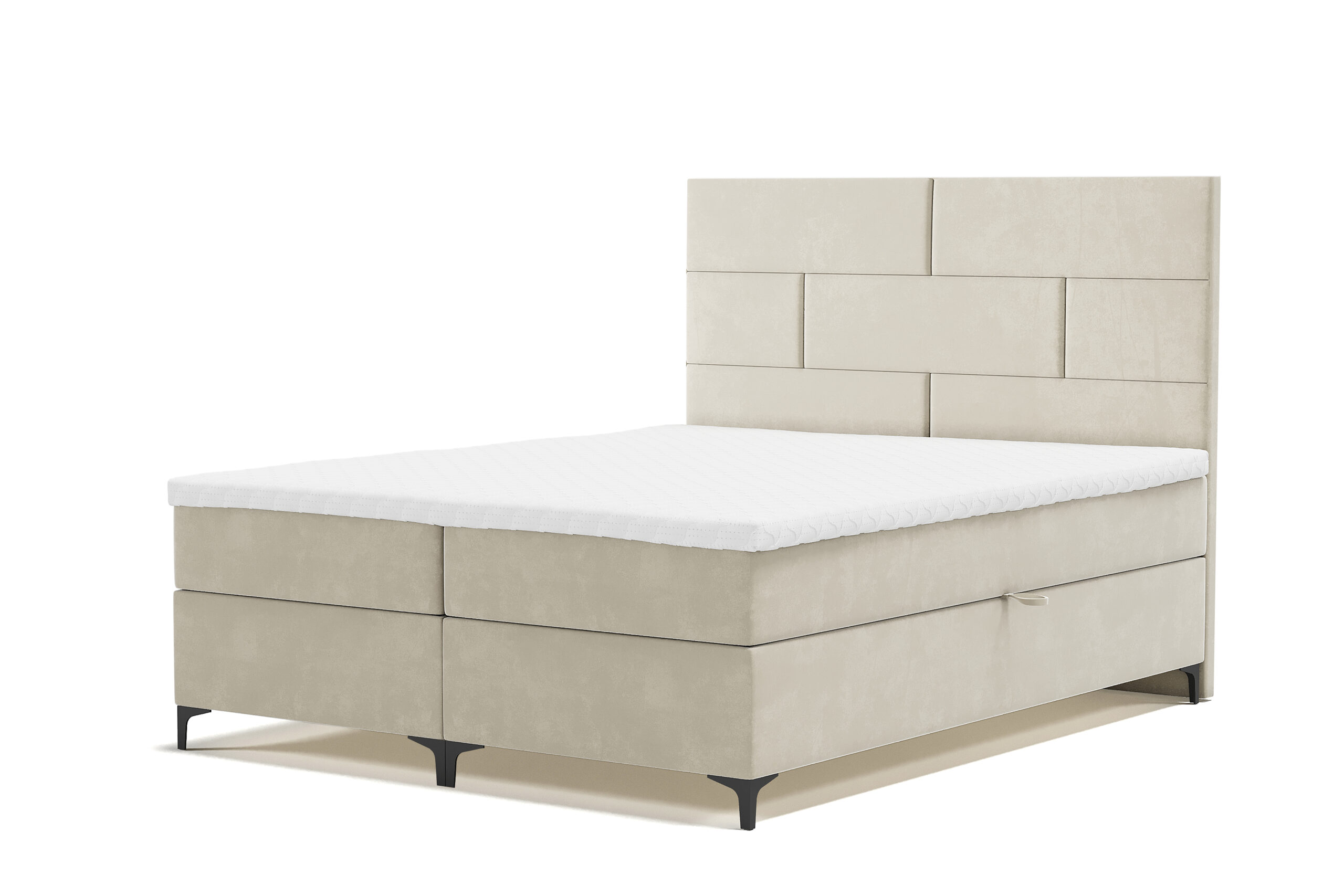 Łóżko kontynentalne BELLA z pojemnikami w tkaninie welur to stylowy i praktyczny mebel do sypialni. Łóżko to posiada trzy warstwy: stelaż, materac i topper. Jednak w tym przypadku, stelaż jest wyposażony w pojemniki, które pozwalają na przechowywanie pościeli lub innych przedmiotów.