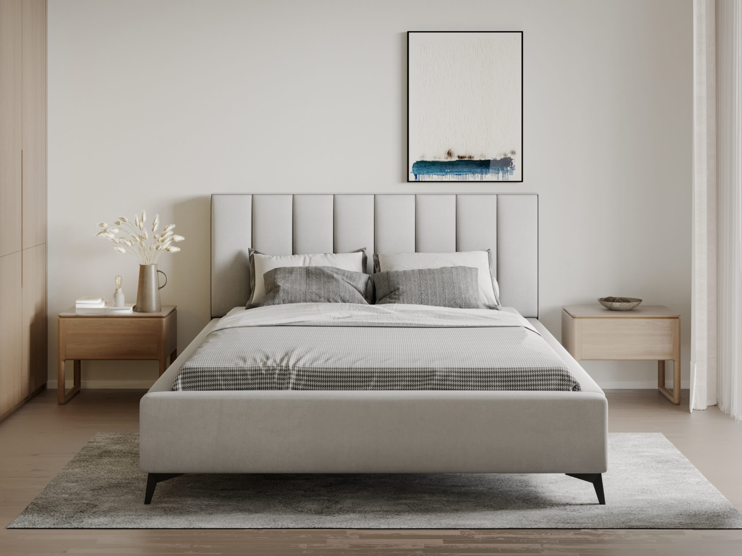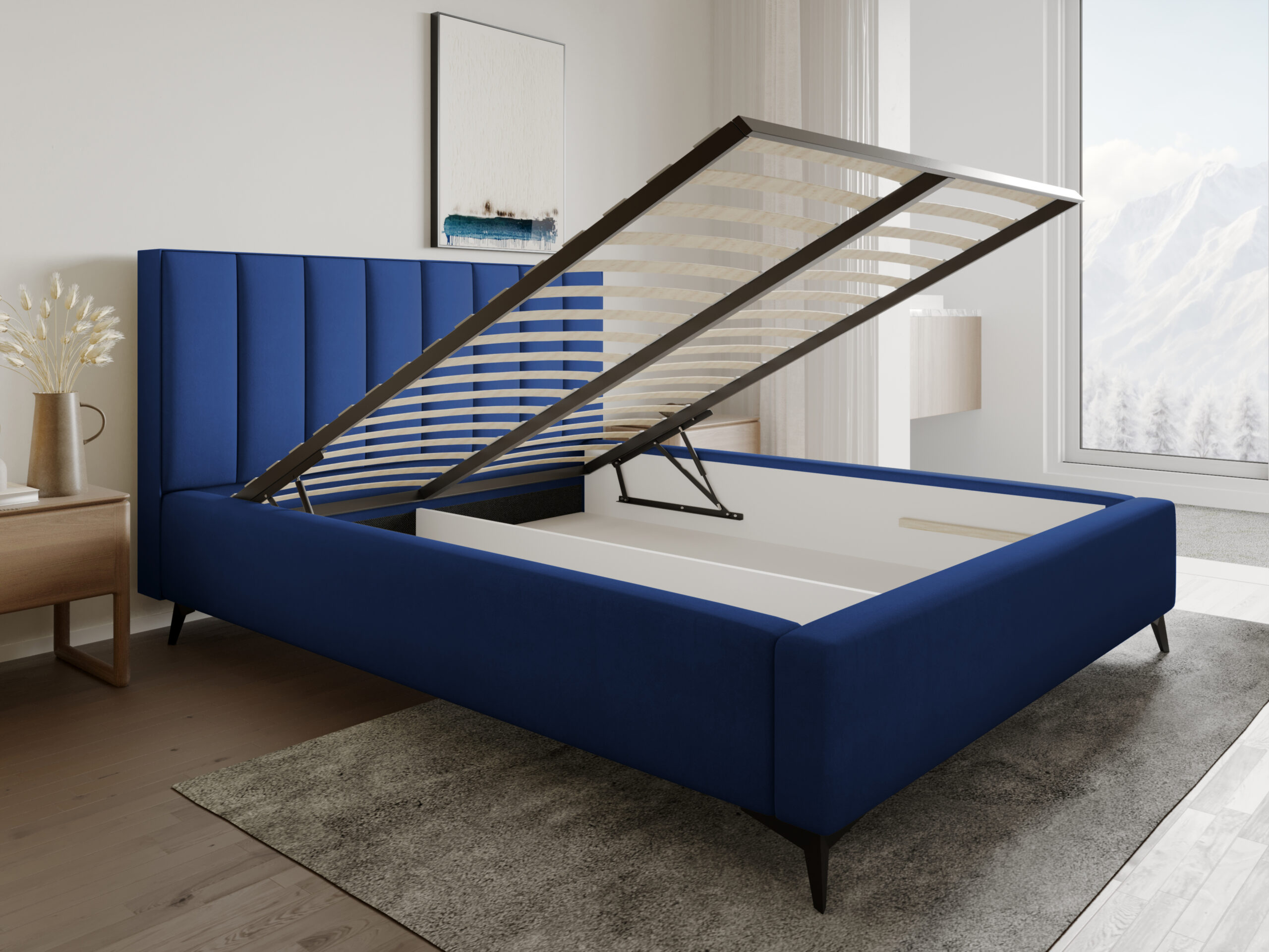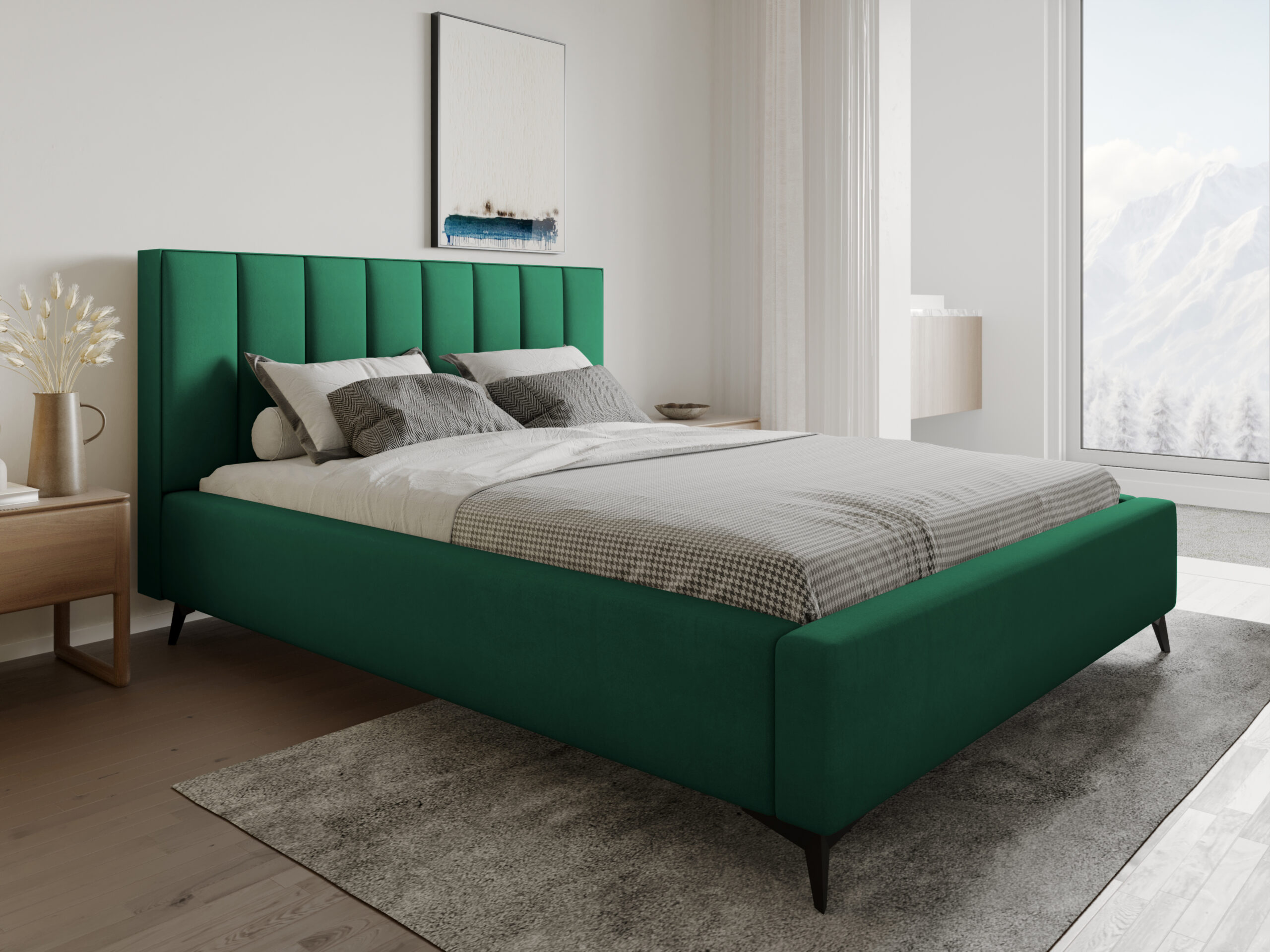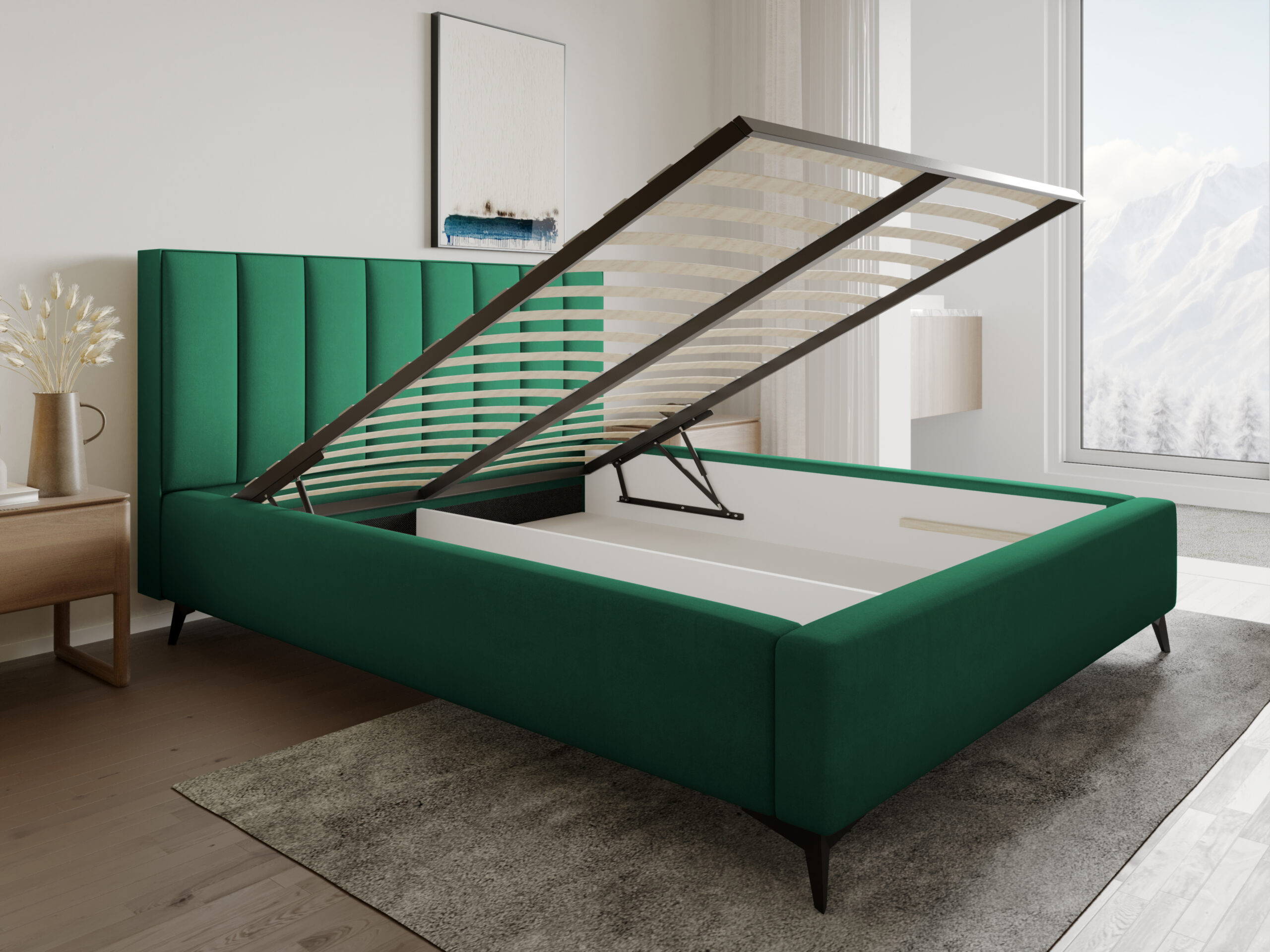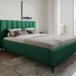 Łóżko Berlin idealnie nadaje się do każdej sypialni, dzięki bardzo wytrzymałemu stelażowi wraz z pojemnikiem na pościel łóżko jest bardzo funkcjonalne, dodatkowo metalowe nóżki dodają stabilizacji oraz pięknego wyglądu. Na aranżacji przedstawione jest łóżko metalowym stelażem z gazowym podnośnikiem, stelaż posiada 34 drewniane listwy po 17 na stronę, które są bardzo wytrzymałe dzięki czemu stelaż będzie nam służył długie lata, oraz bardzo przyjemny w dotyku i czyszczeniu materiał welurowy MAGIC VELVET.