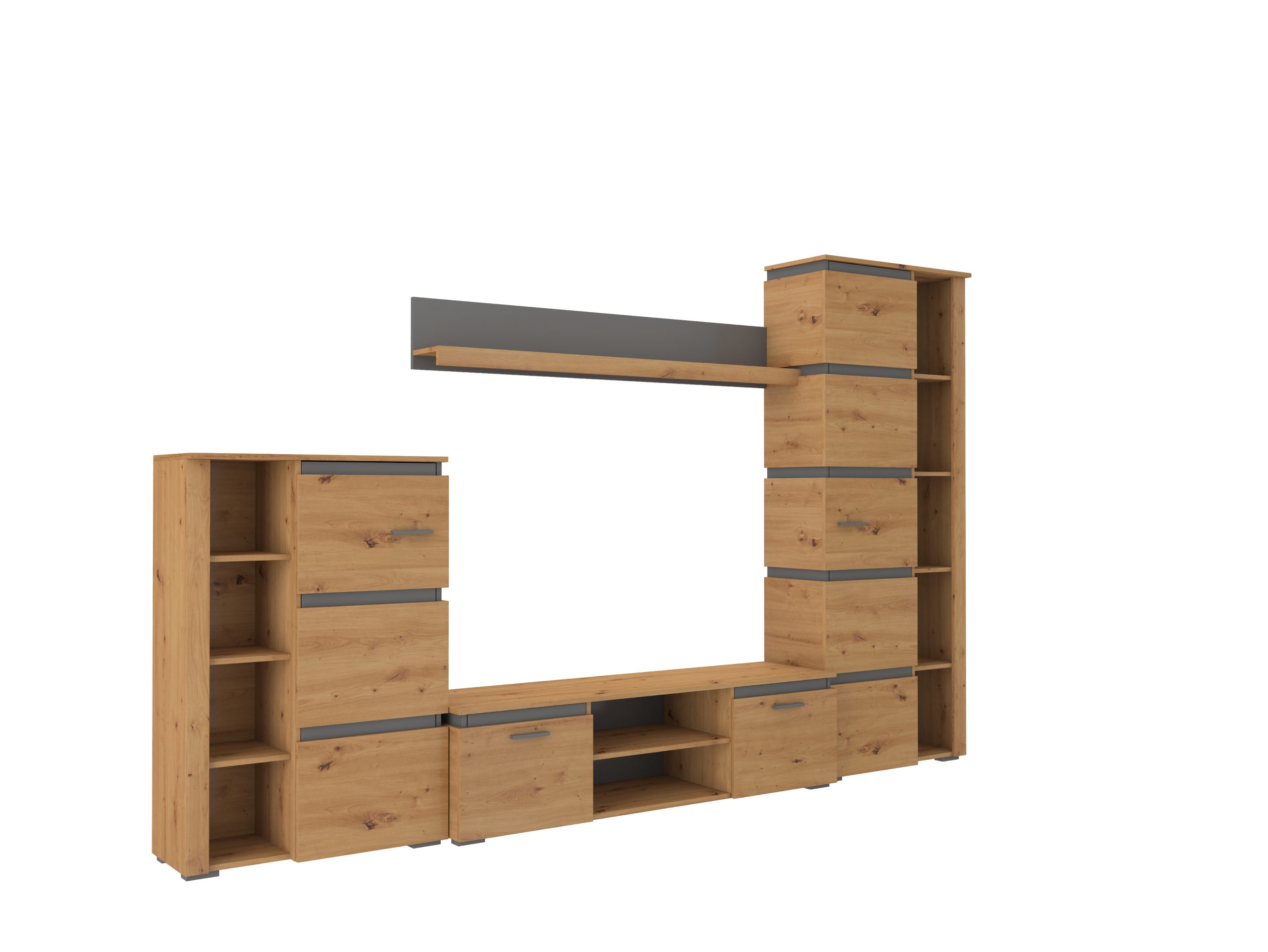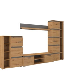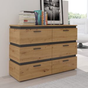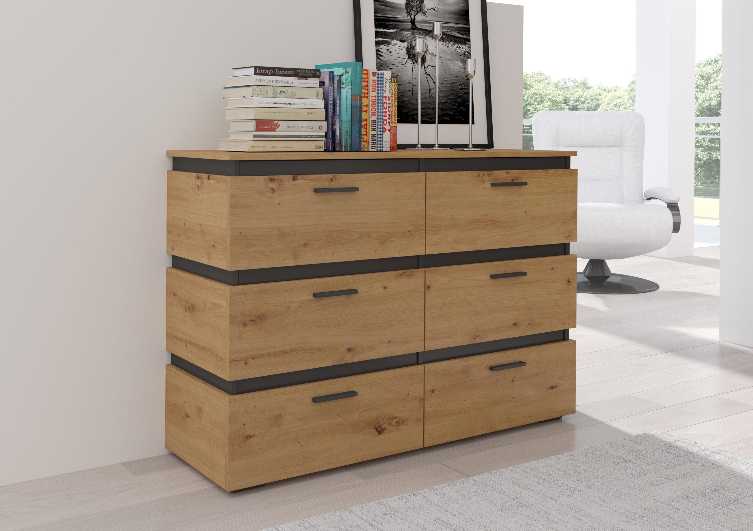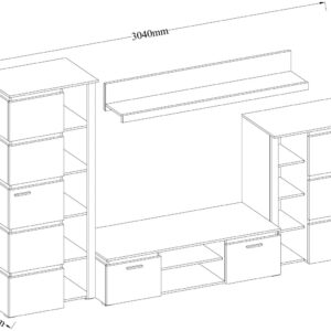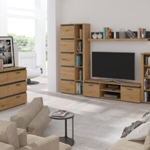 Meblościanka Faro Komoda cechuje się nietypowym wyglądem oraz niepowtarzalnie dobraną kolorystyką. Odmieni każdy pokój dzienny i nada mu oryginalności. Wcięcia w meblach mają niezwykły charakter lekkości, a jednocześnie wyglądają bardzo nowocześnie i stylowo. Całość została utrzymana w niecodziennym klimacie, który stworzy Państwa salon jako przyjazne i przytulne miejsce do spędzania czasu. Meblościanka zawiera dwie szafki z półkami, szafkę RTV oraz wiszącą półkę, oraz jest wzbogacona o komodę z 6 szufladami.