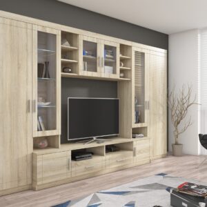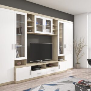 Meblościanka Paris cechuje się dużą ilością pojemnych szafek, witryn na ekspozycje elementów dekoracyjnych, półek na przeróżne dodatki ozdabiające salon oraz specjalnym miejscem na telewizor wraz z miejscem na elektronikę i akcesoria. Meble będą idealnie pasować do dużego i nowoczesnego salonu.