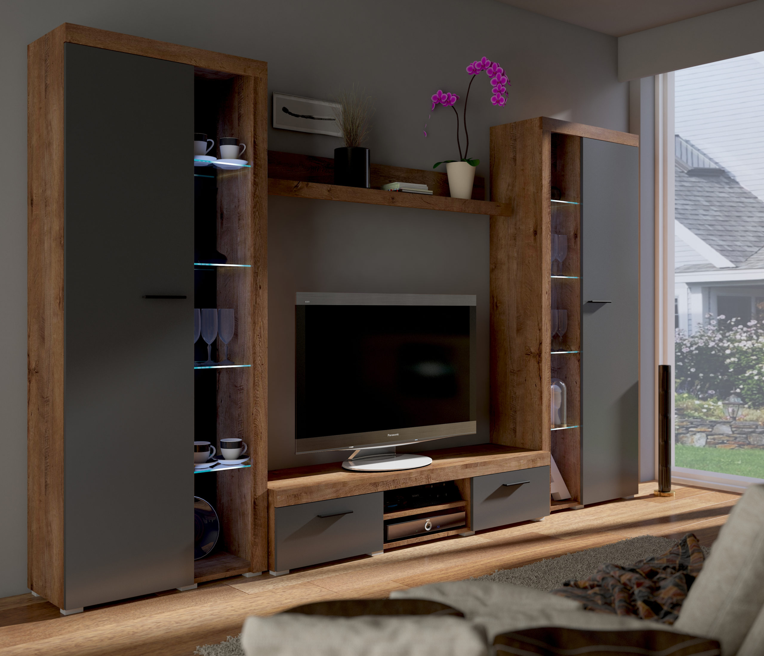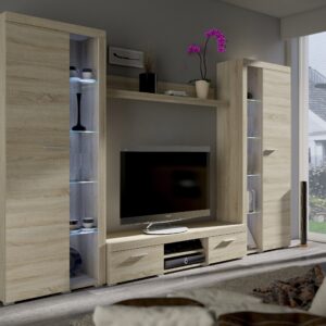 Meblościanka Rumba XL to nowoczesny zestaw nadający się do każdego rodzaju wnętrz.  Produkt jest stworzony dla klientów ceniących sobie minimalizm i prostotę. Meblościanka została wykonana z płyty laminowanej. Meblościanka Rumba XL jest powiększeniem meblościanki Rumba i posiada dwie wysokie witryny wyposarzone w szklane półki, które dodają oryginalnego wyglądu. Zestaw składa się z następujących elementów. Jest możliwe dokupienie oświetlenia LED.