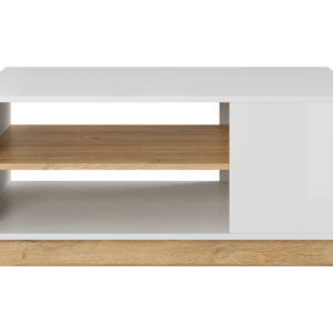 Stolik Kawowy Arco z zestawu Mebli salonowych Arco, dzięki swojemu oryginalnemu wyglądowi i frontom w połysku przykuwa uwagę każdego gościa w twoim domu, Stolik ma pod spodem pojemną półeczkę dzięki której ma poszerzone zastosowanie.