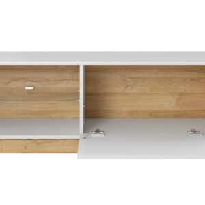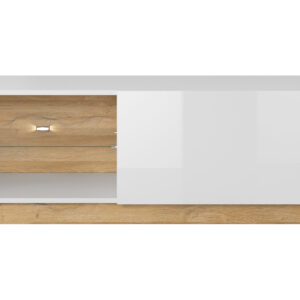 Szafka RTV Arco z zestawu Mebli salonowych Arco, dzięki swojemu oryginalnemu wyglądowi i frontom w połysku przykuwa uwagę każdego gościa w twoim domu, Szafka jest na systemie push-to-open dzięki czemu wystarczy delikatnie nacisnąć by otwierały się fronty dodatkowo zastosowane są zawiasy z domykiem.