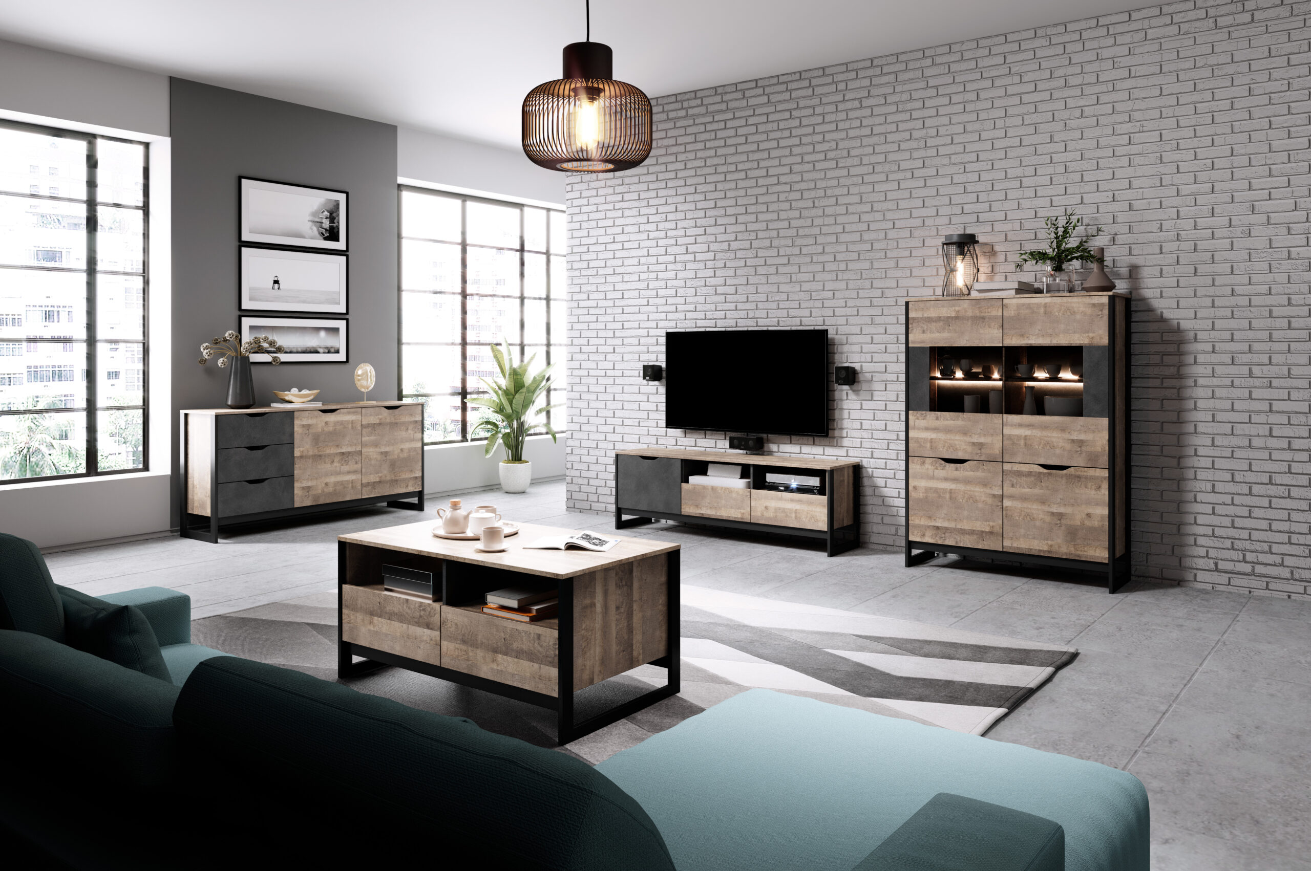 Kolekcja ARDEN to meble w oryginalnym, industrialnym stylu. Połączenie dębu klepkowego z lekko porysowanym, ciemnoszarym metalem, przyciemnione szyby witryn z hartowanego szkła, ciemny, kontrastowy HDF oraz poziome oświetlenie półek nadadzą wnętrzu niepowtarzalnego, loftowego klimatu. Całość podkreślona została na bokach ramkami z naturalnej sklejki w kolorze czarnym, służącymi jako nogi.