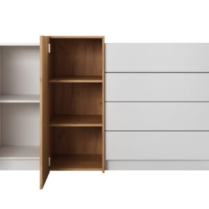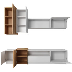 Meble do salonu 3D to drewniane naturalne akcenty, które przenikają i ocieplają biel co sprawia, że wnętrze zyskuje niepowtarzalny charakter. Prosta, lecz oryginalna forma brył umożliwi ciekawą aranżację przestrzeni w każdym salonie. Dodatkowo w meblach jest zastosowany system push-to-open – bez uchwytowy system otwierania.